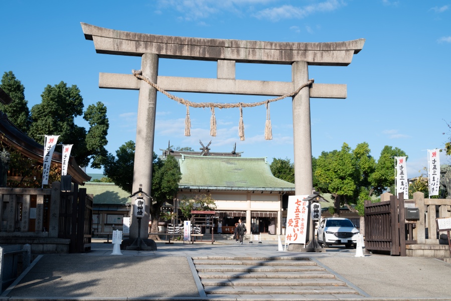 社伝によれば、同社は紀元前663年、神武天皇が東征の際、国土の神である生島大神・足島大神を石山﨑(現在の大阪城付近)にお祀りしたことに起源します。その後、天正13年(1585)、豊臣秀吉による大坂城築城に伴い、現在の地に遷座されました。本殿は「生國魂造」という独特の建築様式で、桃山時代の威風を今に伝えています。