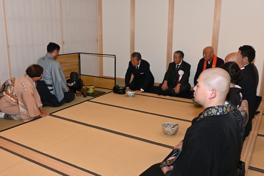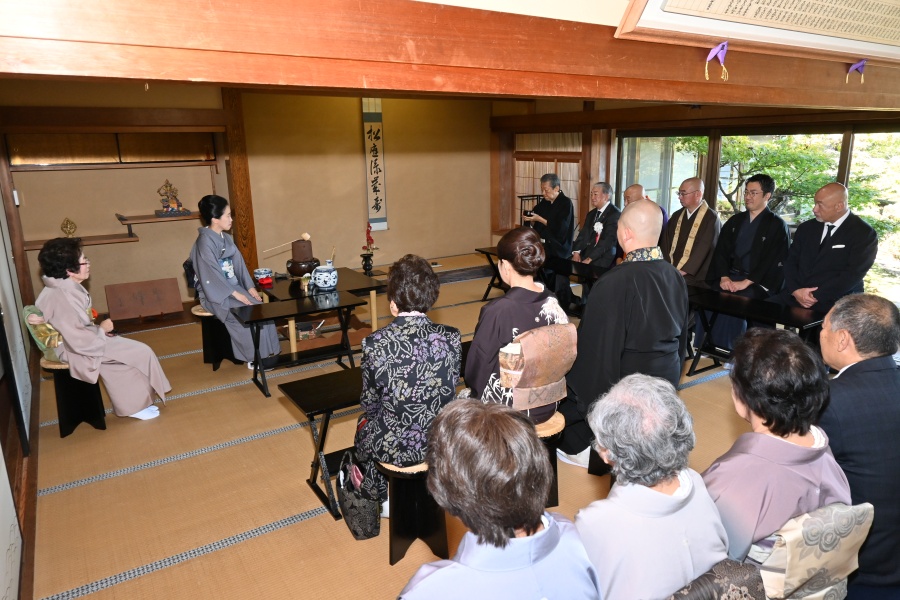 献茶式に際して、客殿に淡交会広島第一支部(淺田博昭支部長)の向井宗伊氏(元副幹事長)担当の濃茶席、御室会館に広島第二支部(橋本宗利支部長)の植松宗栄氏担当の薄茶席が設けられ、参列者に一碗が呈されました。