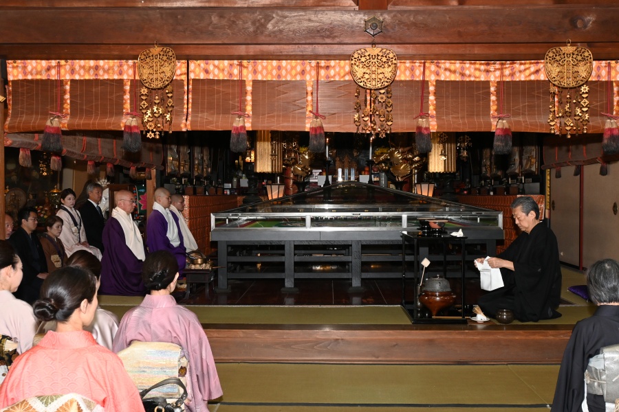 午前10時、家元は、伊住宗禮様とともに観音堂に入り、点前座に着座。濃茶と薄茶を謹点し、ご本尊に捧げられました。