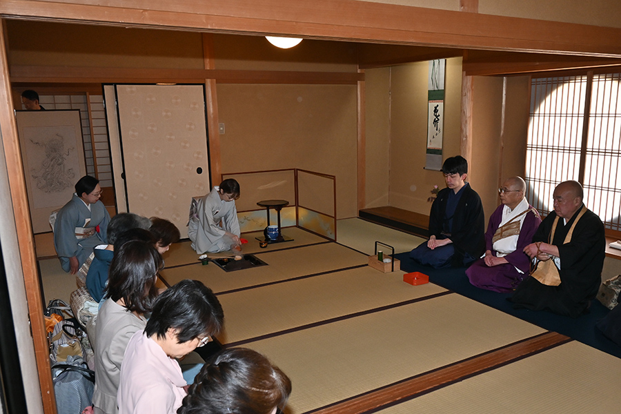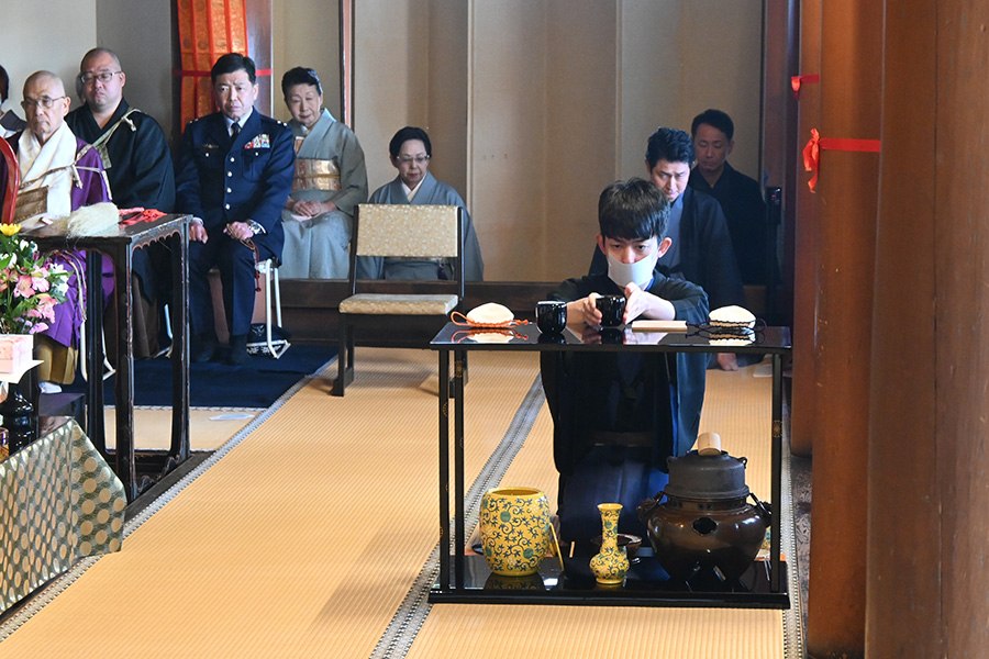 午前10時、若宗匠は本堂に進み、点前座に着座。濃茶と薄茶を謹点し、ご本尊へ捧げられました。