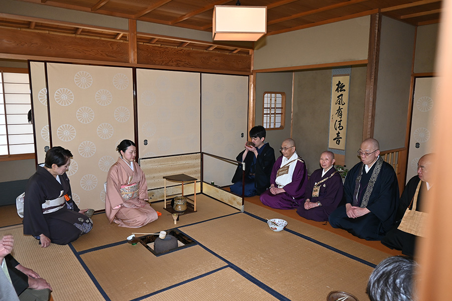 献茶式に際して、慶久庵に淡交会奈良支部(筒井寛昭支部長)の山内宗美氏(参与)担当の本席、東書院に奈良支部担当の副席が設けられ、参列者に一碗が呈されました。