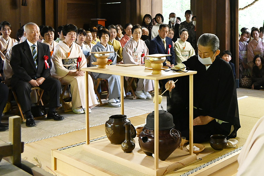 午前10時、家元は本殿に入り、点前座に着座。濃茶三盌を謹点し、三柱のご祭神に捧げられました。