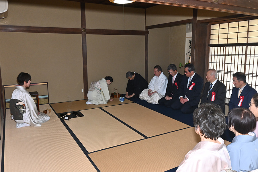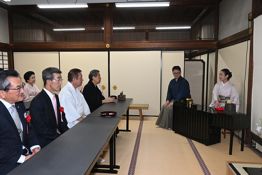 献茶式に際して、客殿に淡交会大阪南支部(廣田元孝支部長)担当の本席、集会所に同青年部担当の副席が設けられ、参列者に一碗が呈されました。
