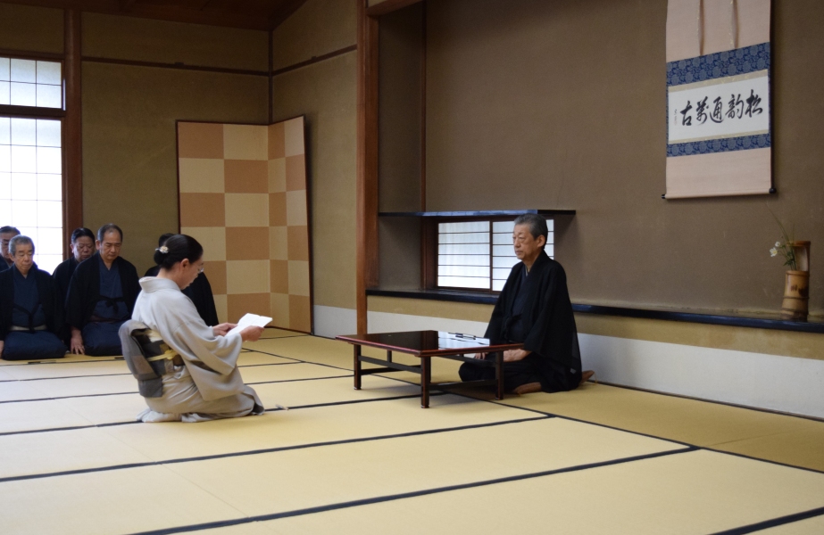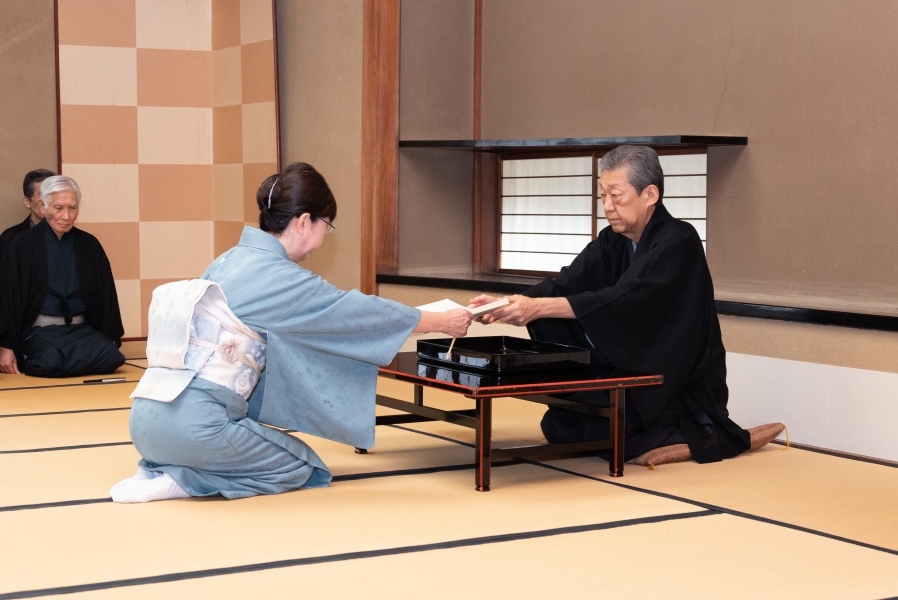 最終日の午後3時より行われた閉講式では、千 宗室家元が受講者代表の山田宗真氏(東京第七東支部)に修了証を授与し、「期間中に教わったことの全てを覚えようと焦る必要はありません。今回の経験を大切にし、次への一歩としてください」と挨拶。受講者を代表して栗田宗京氏(秋田支部)が謝辞を述べ、3日間の研修が終了しました。