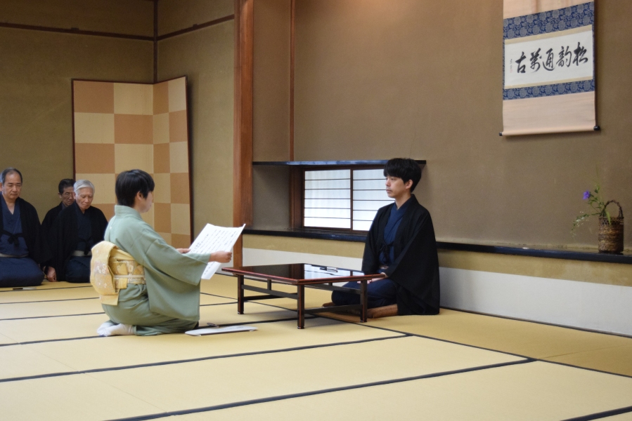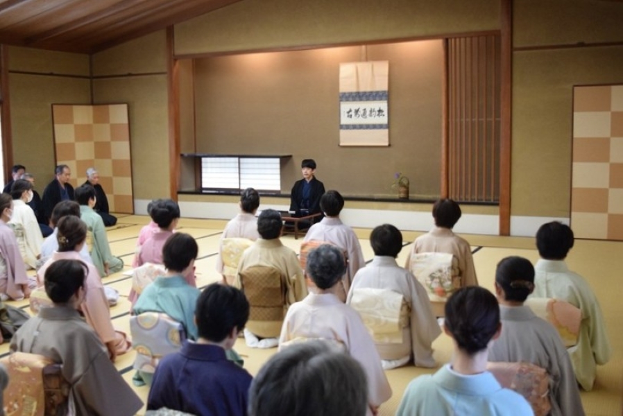 初日の午前9時より、茶道会館にて開講式が行われ、千 宗史若宗匠が「皆さんは強い目的意識を持ち、自分で決断して来られたことと思います。3日間しっかりと頑張って、良い経験として地元に帰っていただければと思っております」と挨拶。受講者を代表して沼野宗輝氏(奈良支部)が「誓いのことば」を述べました。