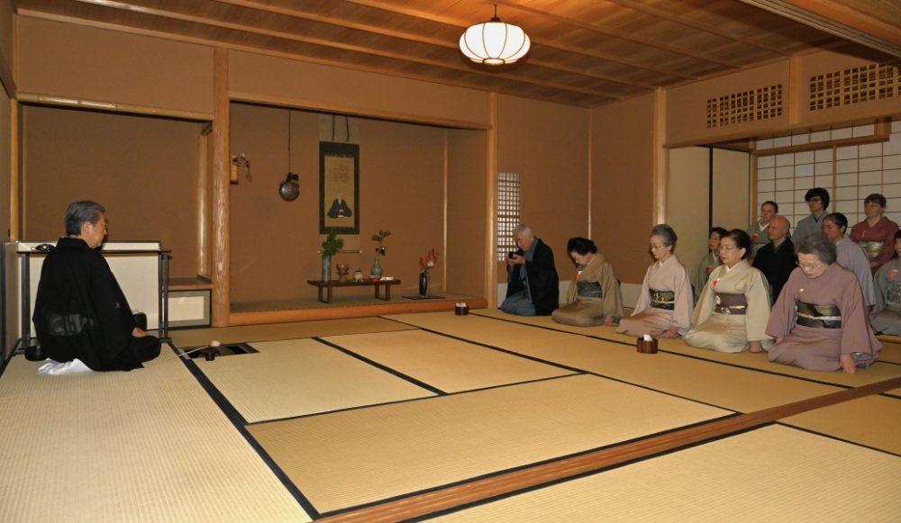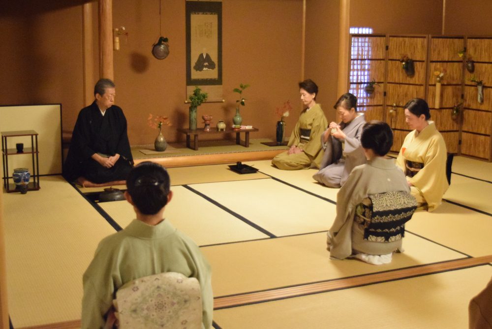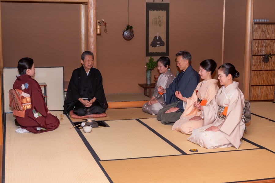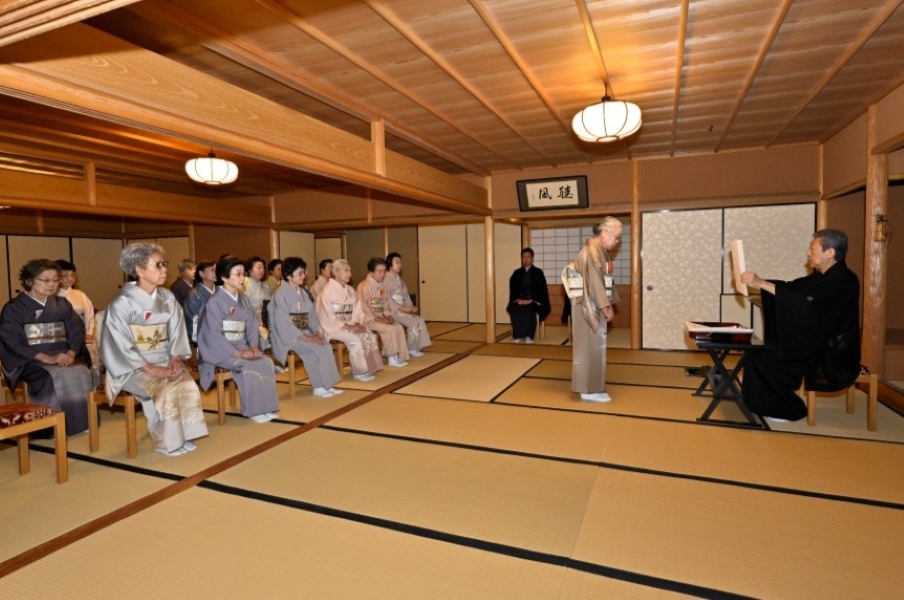 続いて家元が濃茶を練られ、若宗匠が取り次ぎ、嶋村裕吏氏(淡交会参事補・大阪西支部副支部長)と今回参列の名誉師範から、本間宗寿氏(京都南支部参与)、植松宗慶氏(東京第五東支部参与)、中山宗光氏(千葉県支部参与)、青島宗智氏(静岡支部参与)が参列者を代表して順服されました。