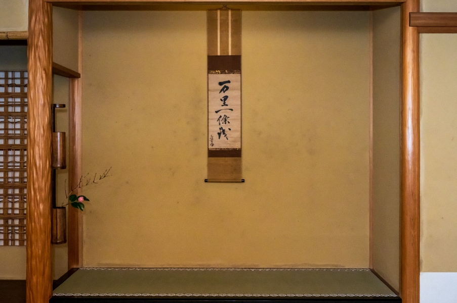 式場となった「咄々斎」の床の間には、京都の式場と同じく、元伯宗旦筆の「万里一條鐵」が掛けられ、仙叟作利休端之坊写の竹二重切花入に曙椿と鶯神楽が入れられ、点前座の点茶盤には坐忘斎家元好みの皆具が据えられました。