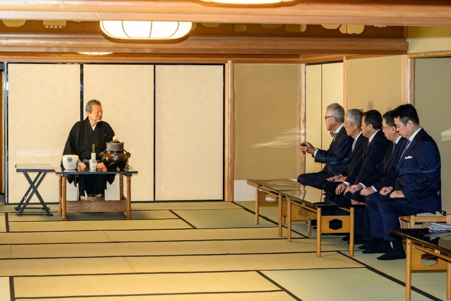 初日第一席には今日庵老分方、淡交会役員らが席入り。千 宗室家元が「一碗のお茶を頂くまでに多くの人々の手間がかけられていることを理解し、心から感謝を捧げられるような次世代を育ててまいりたいと存じます」と挨拶されました。続いて、玄々斎好みの菓子・菱葩が振る舞われた後、家元により各服点にて濃茶が呈されました。
