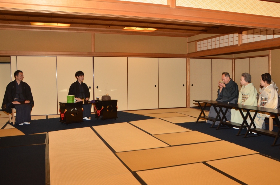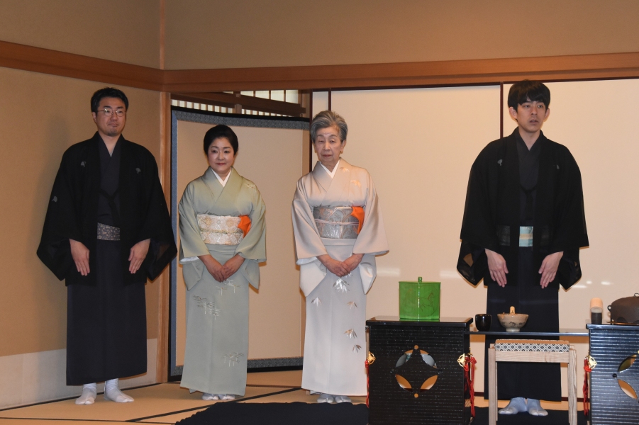 また、「翔鳳の間」に薄茶席が設けられ、千 宗史若宗匠、千 容子家元夫人、伊住弘美様、伊住宗禮様がもてなしをされ、今年の干支にまつわる銘や意匠などの初春の趣向にて一碗が呈されました。