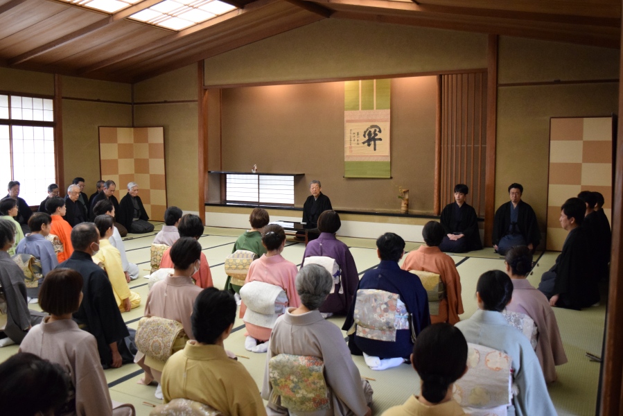 初日は、午前9時から茶道会館で開講式が行われ、千 宗室家元が「いい格好をしようなどと余計なことを考えず、ありのままの自分で点前に臨んでください。自分で自分を生かす5日間にしていきましょう」と挨拶。受講者を代表して五十嵐宗博氏(東京第四東支部)が「誓いのことば」を述べました。
