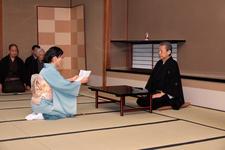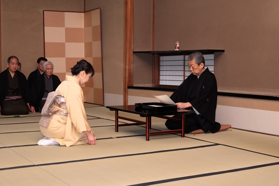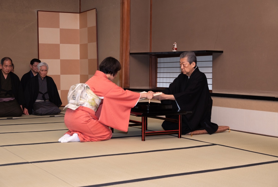 最終日の午後3時から行われた閉講式では、家元が受講者代表の岡島宗敏氏(徳島支部)に修了証を、髙玉宗穂氏(釧路支部)に学校茶道教授者適格証を授与。家元の挨拶の後、受講者を代表して秦 宗季氏(沖縄支部)が謝辞を述べ、5日間の講習が終了しました。