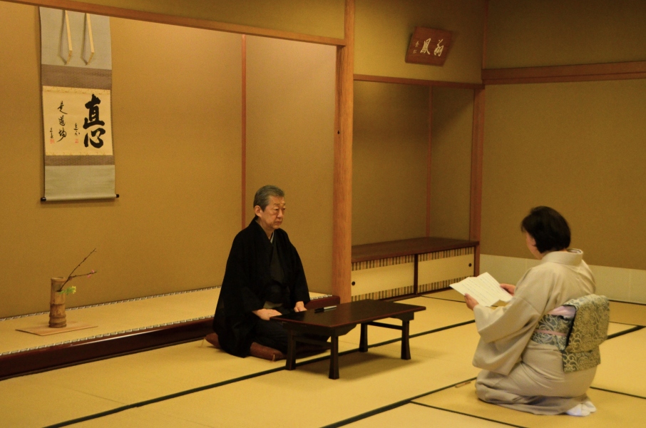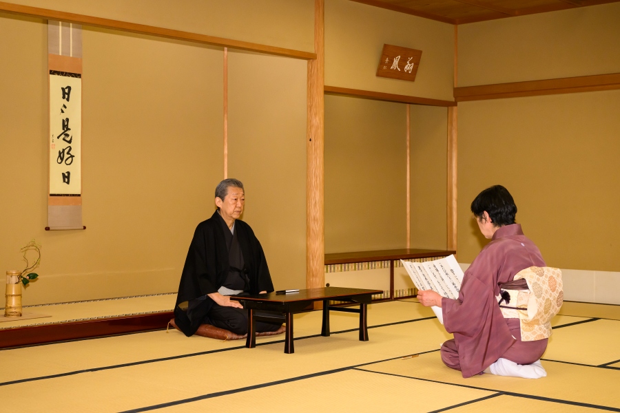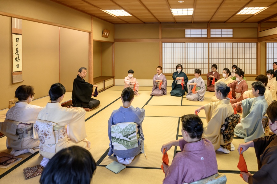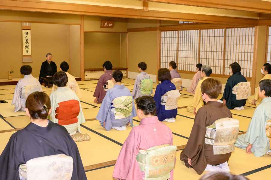 初日は、午前9時30分より「翔鳳の間」にて開講式が行われ、千 宗室家元が「この3日間は利休居士のわび茶の根本に根差した点前を学んでいただきます。基礎を再確認した上で、『構え』を大切に点前をしてください」と挨拶。受講者を代表して堀内宗蓉氏(山梨支部)が「誓いのことば」を述べました。