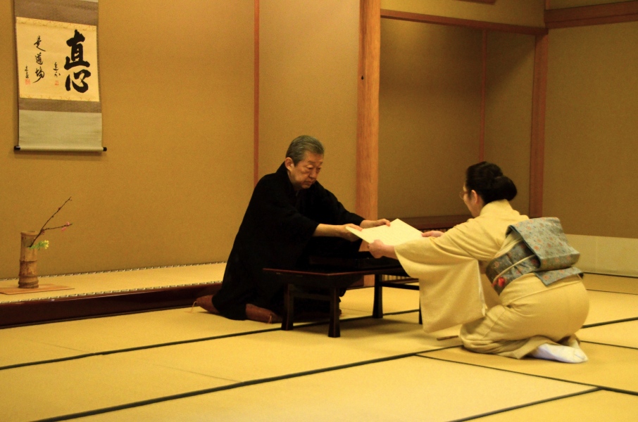 最終日の午後3時より行われた閉講式では、家元が受講者代表の北川宗美氏(高岡支部)に修了証を授与。家元の挨拶の後、受講者を代表して菊地宗由氏(東京第七東支部)が謝辞を述べ、3日間の研修が終了しました。