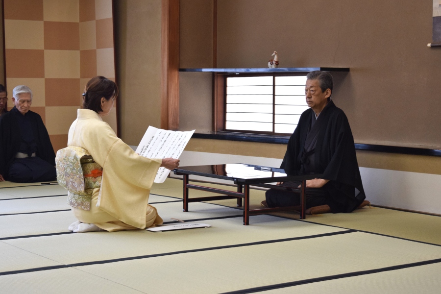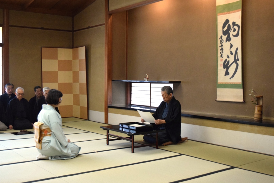 最終日の午後3時より行われた閉講式では、家元が受講者代表の大橋宗朋氏(京都北支部)に修了証を授与。家元の挨拶の後、受講者を代表して鶴岡宗保氏(呉支部)が謝辞を述べ、3日間の研修が終了しました。