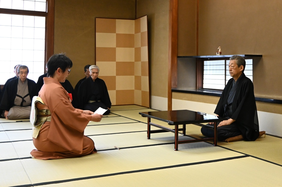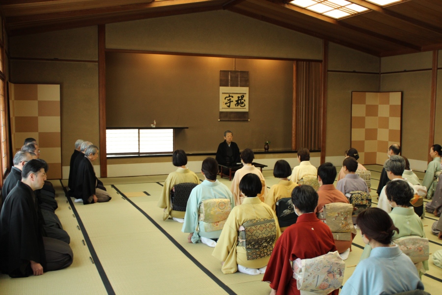 初日は、午前9時より茶道会館にて開講式が行われ、千 宗室家元が「お一人ずつの器は無限大ですが、自分でその器に蓋をしてしまうと学びを取り込めません。人様の点前や客ぶりもよく見て、自分の器を広げてください」と挨拶。受講者を代表して森木宗弘氏(高知支部)が「誓いのことば」を述べました。