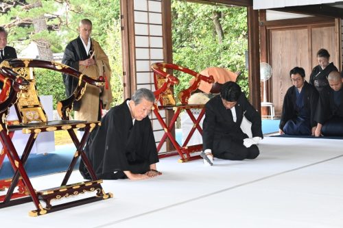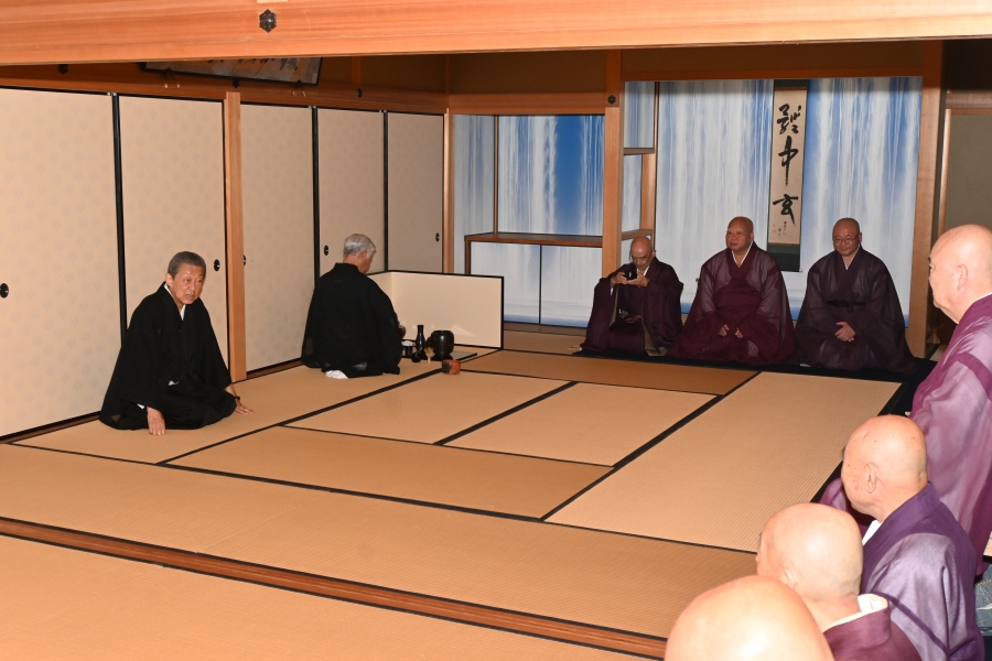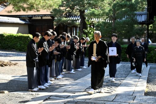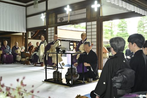 When the service came to a close, Iemoto gave an address, in which he mentioned about Hōunsai Sōshō’s dōgo (monastic name), stating, “Through the name ‘Hansō’ (汎叟, literally “across-the-board venerable old man”) bestowed upon him by Daitokuji, I believe my father truly received immense strength,” and ended by stating, “I extend my gratitude to all of you of the monastery for attending today, and to His Eminence the Chief Abbot for the wonderful final invocation.”