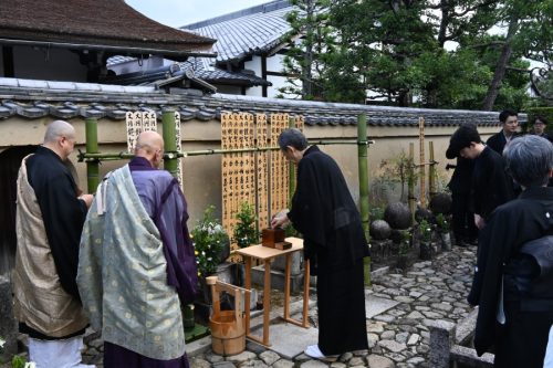 On Tuesday September 30, 2025, the honsō, or main funeral, and memorial service for the ki-ake, or end-of-mourning-period, for the 15th Urasenke Konnichian iemoto, Hōunsai Hansō Sōshitsu Koji, was held at Daitokuji Jukōin temple, in the Kita ward of Kyoto city. The participating priests were His Eminence the Great Zen Master TAKADA Myōhō, Chief Abbot of Daitokuji temple; the Great Zen Master TAJIMA Sekiō Suimōken, Master of the Monks’ Hall at Nanshūji temple (Daitokuji advisor); the Great Zen Master UNO Kōken Keiunshitsu, Master of the Monks’ Hall at Daitokuji temple; the chief priest of Hōjōan temple (Daitokuji advisor); and chief priests of the sub-temples within the Daitokuji precincts. The attendees were Iemoto and Madam SEN Sōshitsu, Wakasōshō SEN Sōshi, other members of the Head Family, relatives, and Konnichian deputy tea masters (gyōtei).