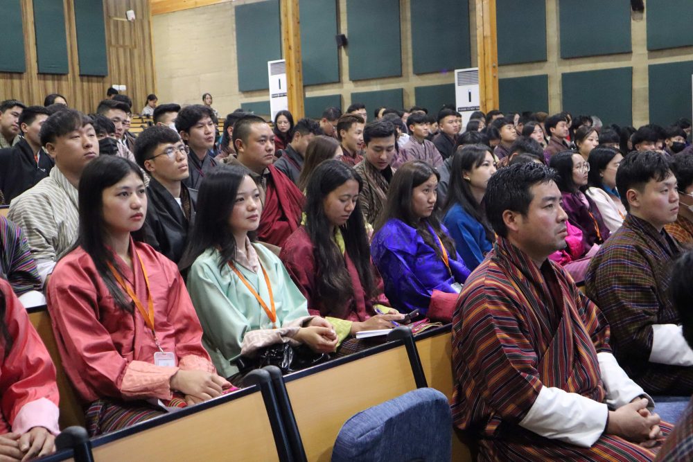 During the day on the 27th, Gyōtei Shimura presented a chadō lecture and demonstration program at the Royal University of Bhutan (RUB). In addition to Director General Natsho Dorji of the Department of Culture and Dzongkha Development at the Bhutan Ministry of Home Affairs, who was the guest of honor, approximately 150 people attended, including university staff, students, and Japanese language learners. Following the lecture and demonstration, usucha (thin tea) was served to some of the attendees, enabling them to actually get a taste of chanoyu in Bhutan.