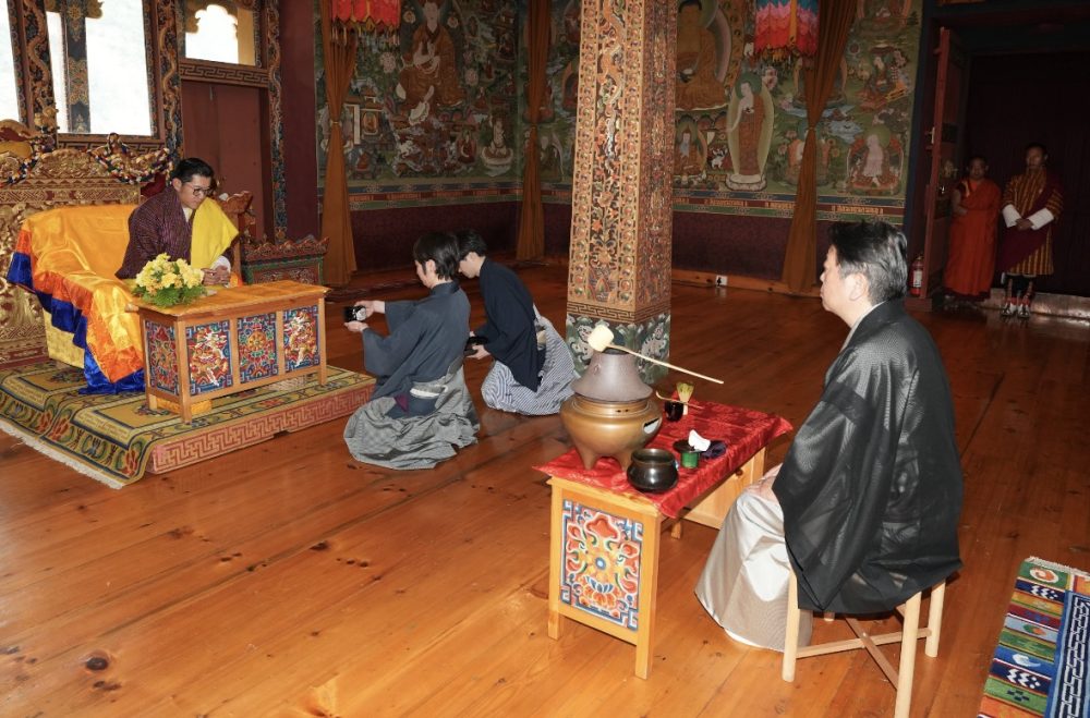 The event that was central to this was the Japanese Emperor’s Birthday Celebration Reception on March 27, at which the team from Konnichian would present an introduction to Japan’s chadō culture. The preceding day, Thursday the 26th, His Majesty King Jigme Khesar Namgyel Wangchuck of the Kingdom of Bhutan received H.E. ONO Keiichi, Ambassador of Japan to India and Bhutan, at Bhutan’s Pangri Zampa Monastery, and at this time, Gyōtei Shimura prepared a bowl of koicha (thick tea) for His Majesty.