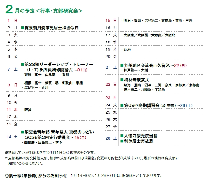 各会員の方 お知らせ行事・支部研究会(2月) 行事・支部研究会(2月) 各会員の方 令和8年01月06日 今後の行事・研究会予定については下記をご覧ください。 ※最新の情報は各支部にお問い合わせください。 関連記事 各会員の方 2026年01月10日各会員の方1月の事務局休業日のお知らせ2026年01月06日各会員の方行事・支部研究会(2月)2025年12月19日青年部第37期リーダーシップ・トレーナー(L・T)出向員研修 第6回研修・修了式